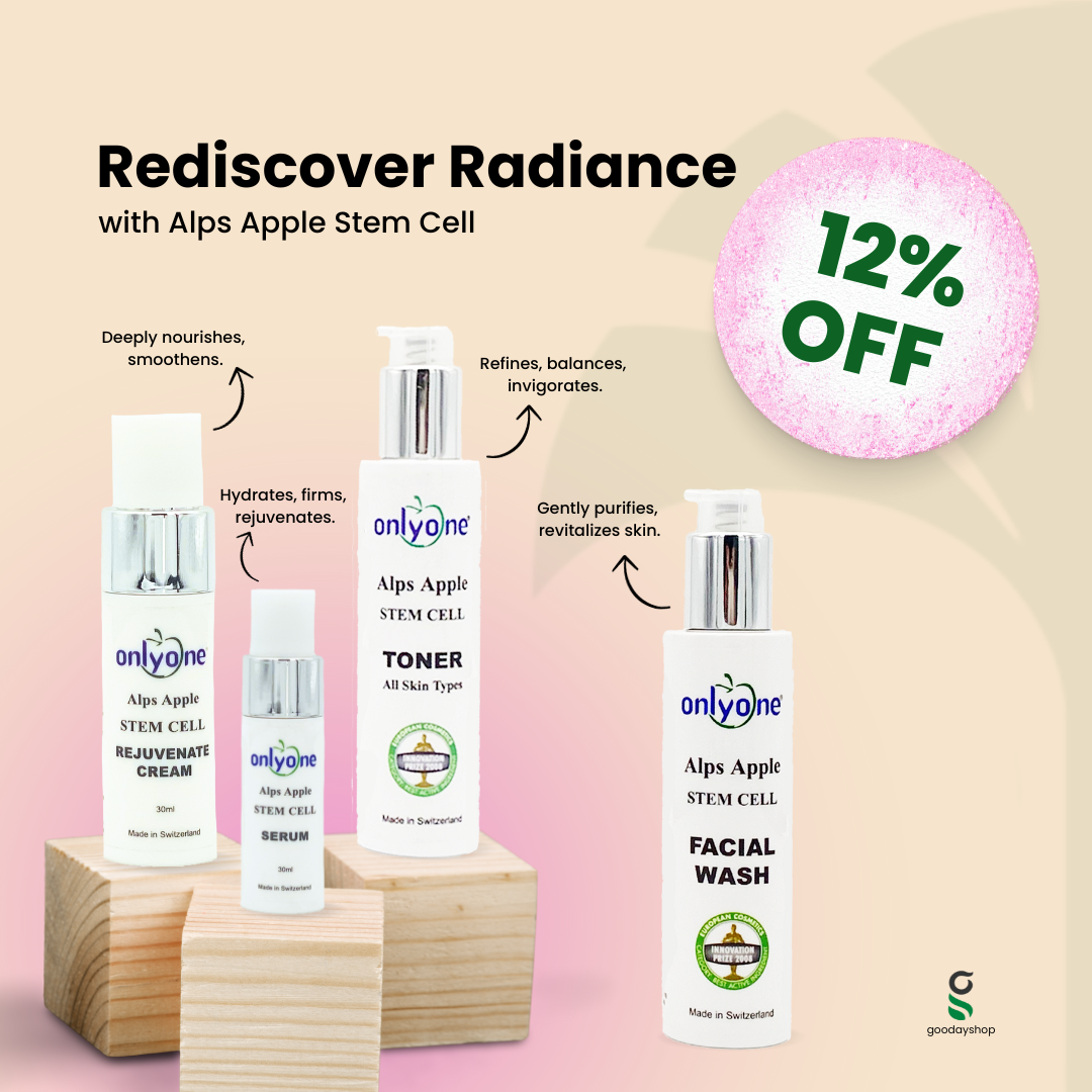 Experience the transformative OnlyOne Alps Apple Stemcell Vital Skincare Set. Featuring a facial wash, toner, serum, and rejuvenate cream, this collection harnesses the power of apple stem cells for a radiant and rejuvenated complexion.